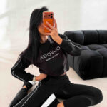 Górna część kompletu to bluza o klasycznym kroju z okrągłym dekoltem, który nadaje całości ponadczasowej formy. Długie rękawy zakończone elastycznymi ściągaczami zapewniają stabilność i estetyczne wykończenie. Subtelny, tłoczony haft z logo OLAVOGA oraz hasłem „ESSENCE OF COMFORT” na przodzie stanowi wyrafinowany akcent brandingowy. Wzdłuż rękawów poprowadzono delikatne, kontrastowe lampasy, które nadają bluzie nowoczesnego, modowego wyrazu.