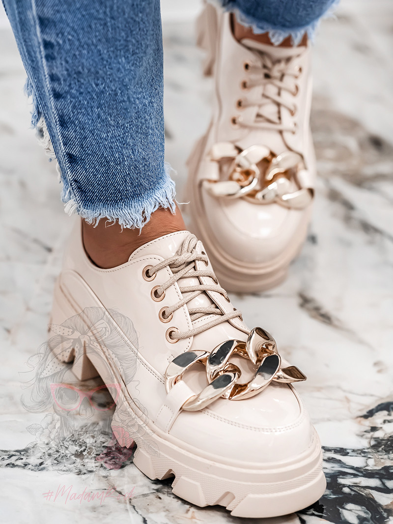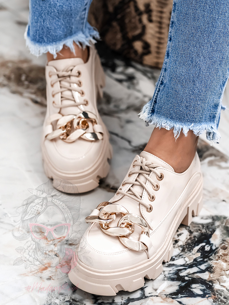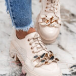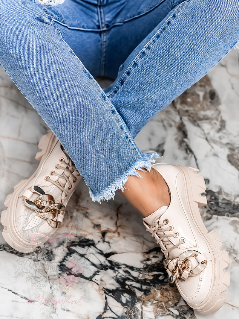 Modne trampki damskie Benus Rock dopełnią wiele stylizacji w ciepłe dni. Wykonane z tkaniny z wysokiej półki w modnym w tym sezonie kolorze beżowym. Model na białej, podwyższanej, gumowej podeszwie z zaokrąglonym noskiem. Sznurowane z przodu sznurówkami w kolorze całości. Wyjątkowości dodają im łańcuchy. Klasyczne trampki to must have każdej kobiety.Bardzo wygodne, sprawdzą się jako uzupełnienie wielu stylizacji.