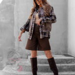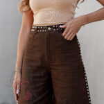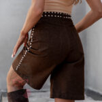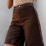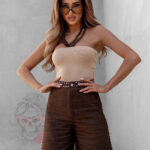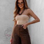 Spodenki bermudy Asho w brązowym kolorze to elegancka i nowoczesna propozycja dla kobiet, które cenią wygodę i styl. Wykonane z wysokogatunkowego, lejącego się materiału, prezentują się lekko i swobodnie, a jednocześnie zachowują szykowny charakter. Przedłużony fason pięknie podkreśla sylwetkę, a zapięcie na guzik i suwak zapewnia komfort noszenia. Model wyposażony jest w praktyczne kieszenie z przodu i z tyłu. Całość zdobią srebrne napy umieszczone przy pasie i po bokach nogawek, które dodają spodenkom oryginalności i modnego charakteru.