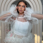 Model wyróżnia się efektowną stójką wykończoną falbanką, która dodaje bluzce romantycznego uroku. Długie rękawy zostały ozdobione wielowarstwowymi falbankami wykonanymi z tej samej koronki, co stójka — tworzą one subtelnie rozkloszowany, finezyjny efekt. Dół bluzki wykończono w podobnym, bogatszym stylu, dzięki czemu całość prezentuje się niezwykle kobieco i lekko.