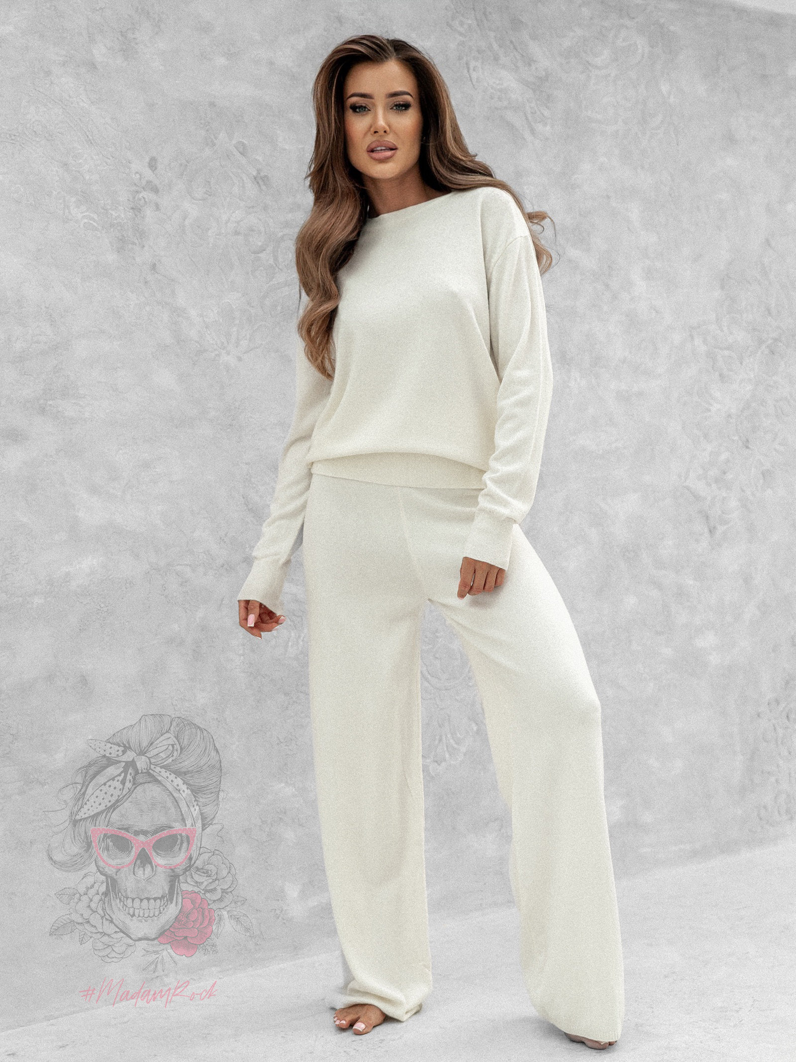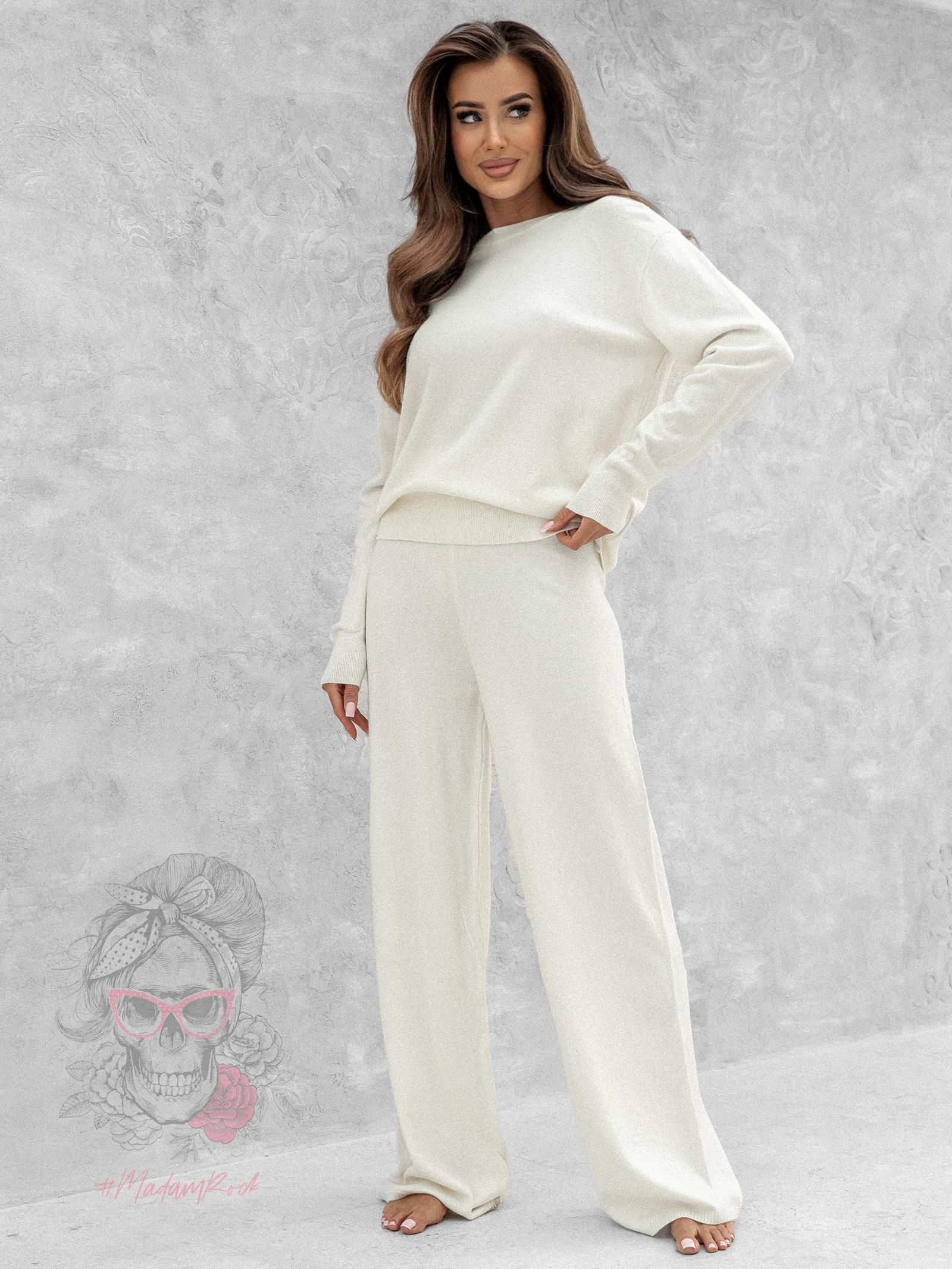Zarówno sweter, jak i spodnie Moszer wykonane są z wysokiej jakości dzianiny, która jest elastyczna, delikatna dla skóry i niezwykle przyjemna w dotyku. Materiał zapewnia ciepło, a jednocześnie pozostaje lekki i oddychający, dzięki czemu komplet sprawdzi się o każdej porze dnia. Co istotne, starannie dobrany splot sprawia, że dzianina zachowuje swój kształt nawet po wielu praniach, gwarantując trwałość i estetyczny wygląd na długo.