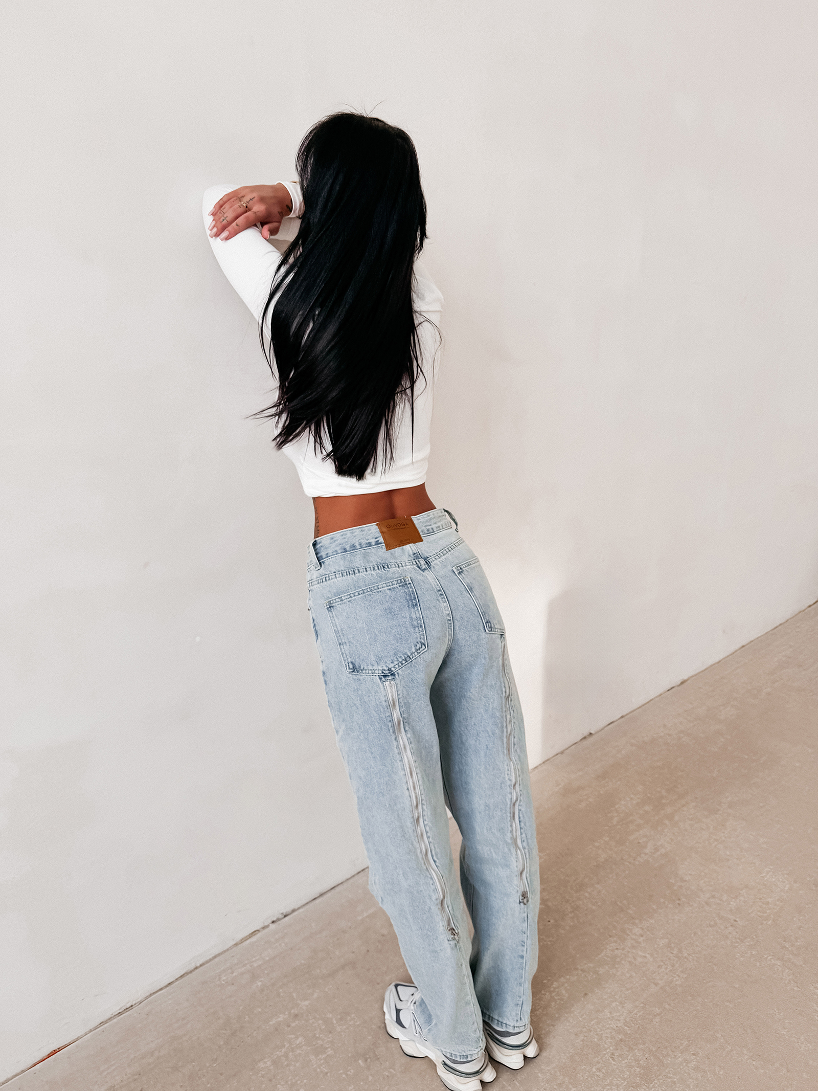 Model SKYLINE doskonale komponuje się z krótkimi topami, koszulami i oversize’owymi bluzami.