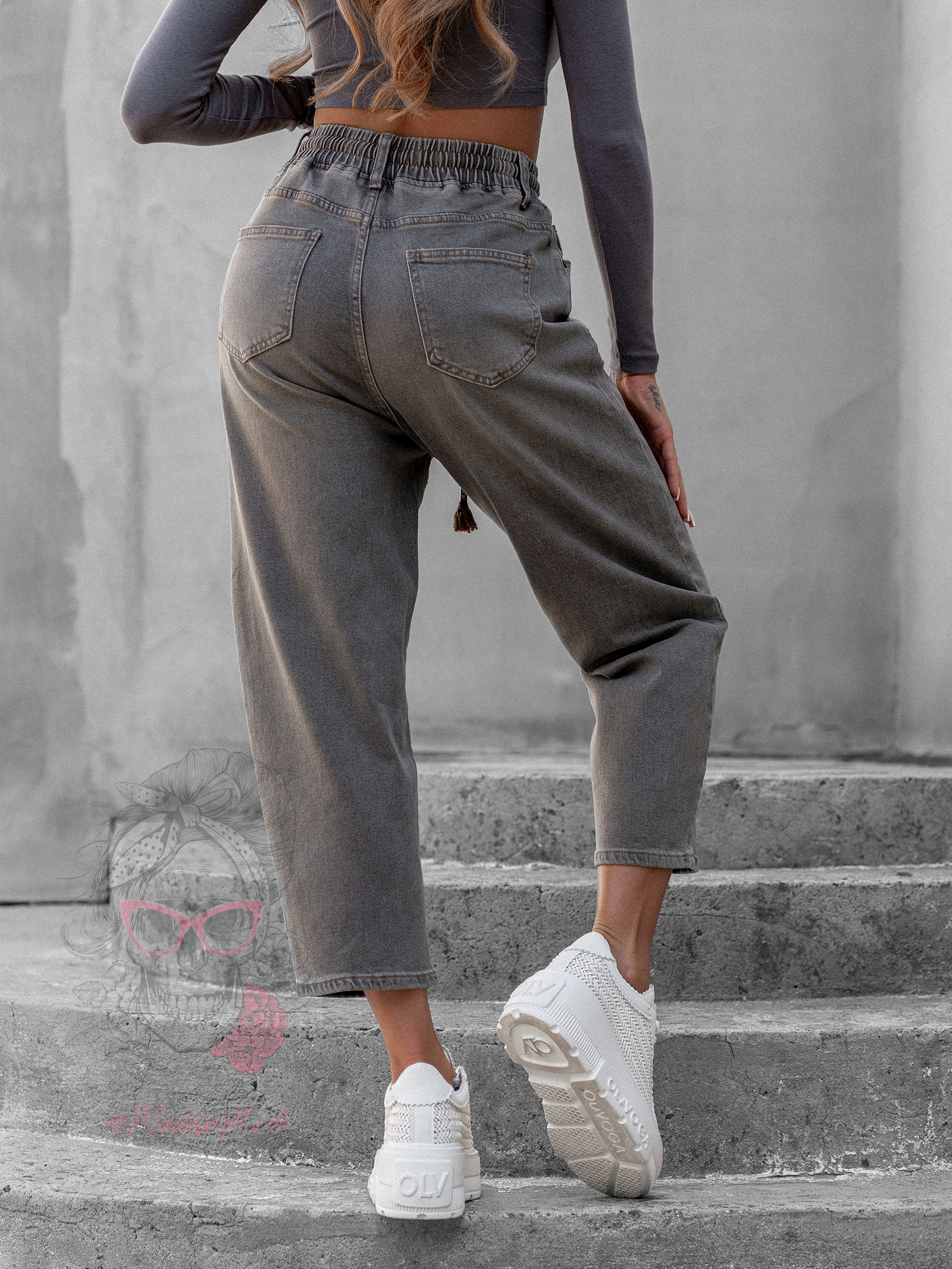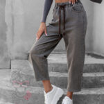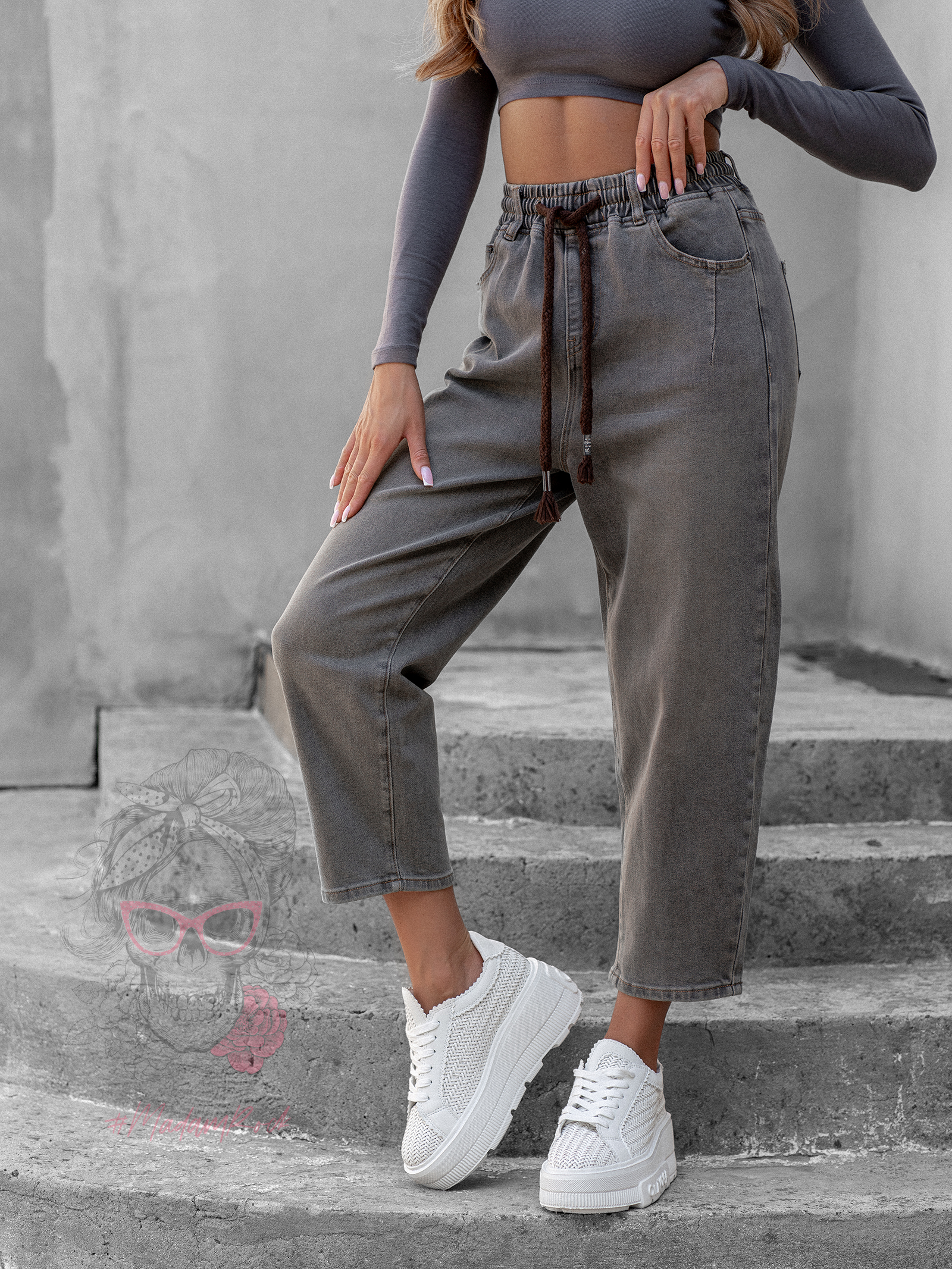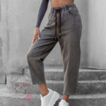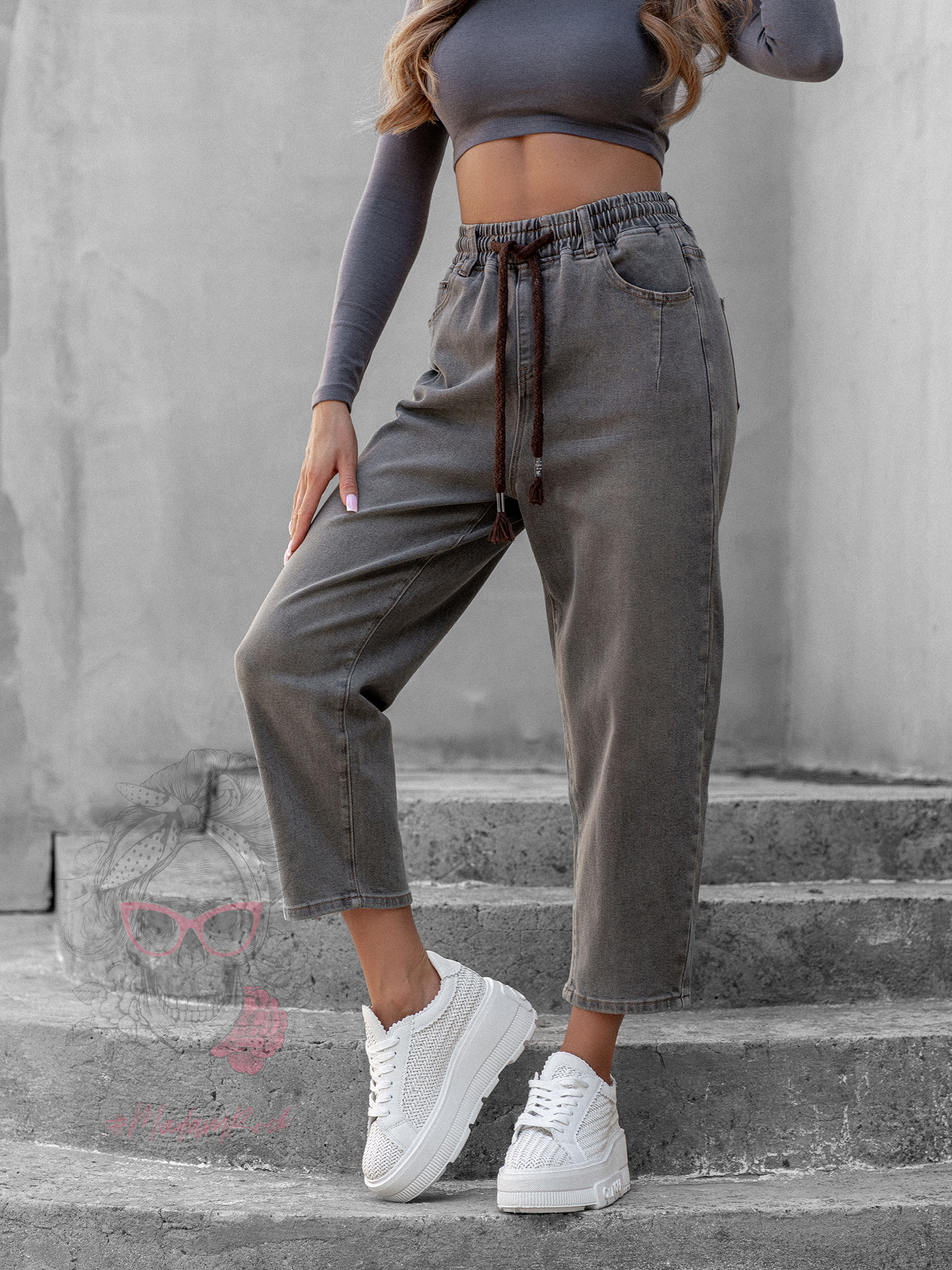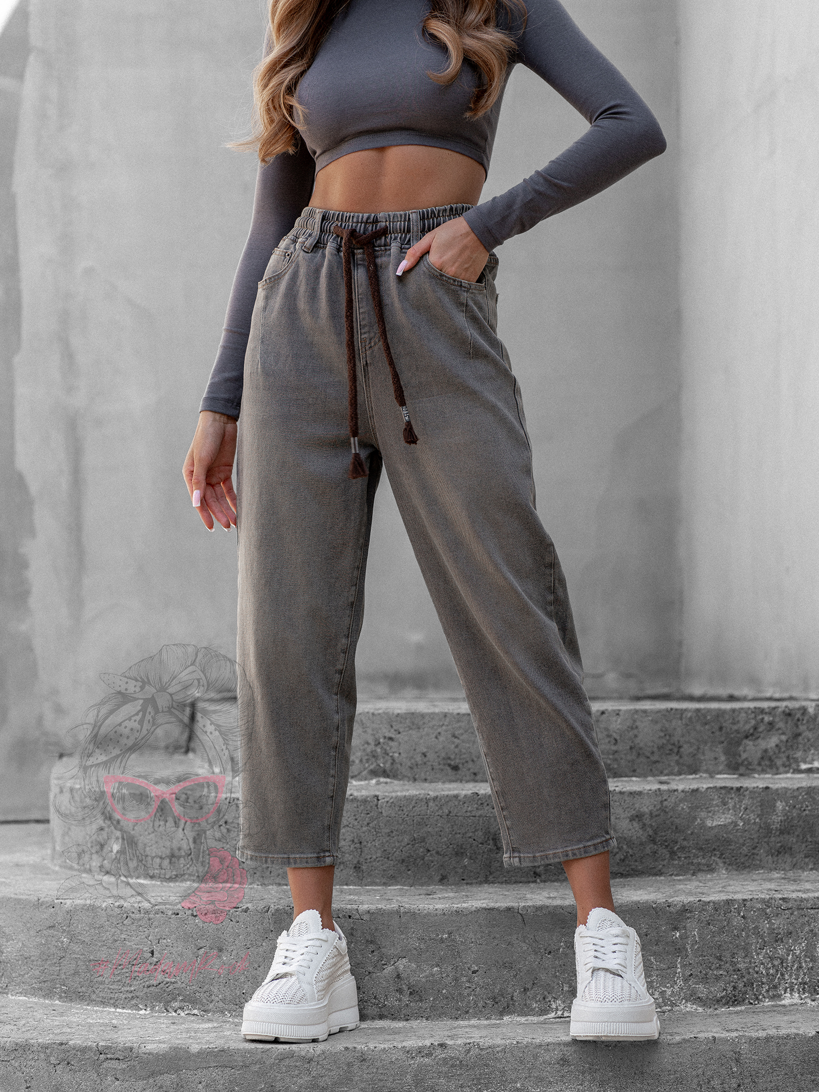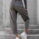 Spodnie jeansowe Ceste w odcieniach melanż khaki i brązu to idealne połączenie wygody i modnego designu. Wykonane z elastycznego denimu z efektem sprania i dekatyzacji, wpisują się w styl vintage i casual. Fason mom jeans z gumką w pasie oraz przewiązaniem brązową sznurówką zapewnia komfort noszenia i możliwość regulacji obwodu. Spodnie zapinane są na guzik i suwak, posiadają praktyczne kieszenie z przodu i z tyłu, a całość zdobi skórzana naszywka przy szlufkach, która podkreśla ich oryginalny charakter.