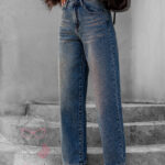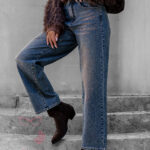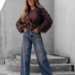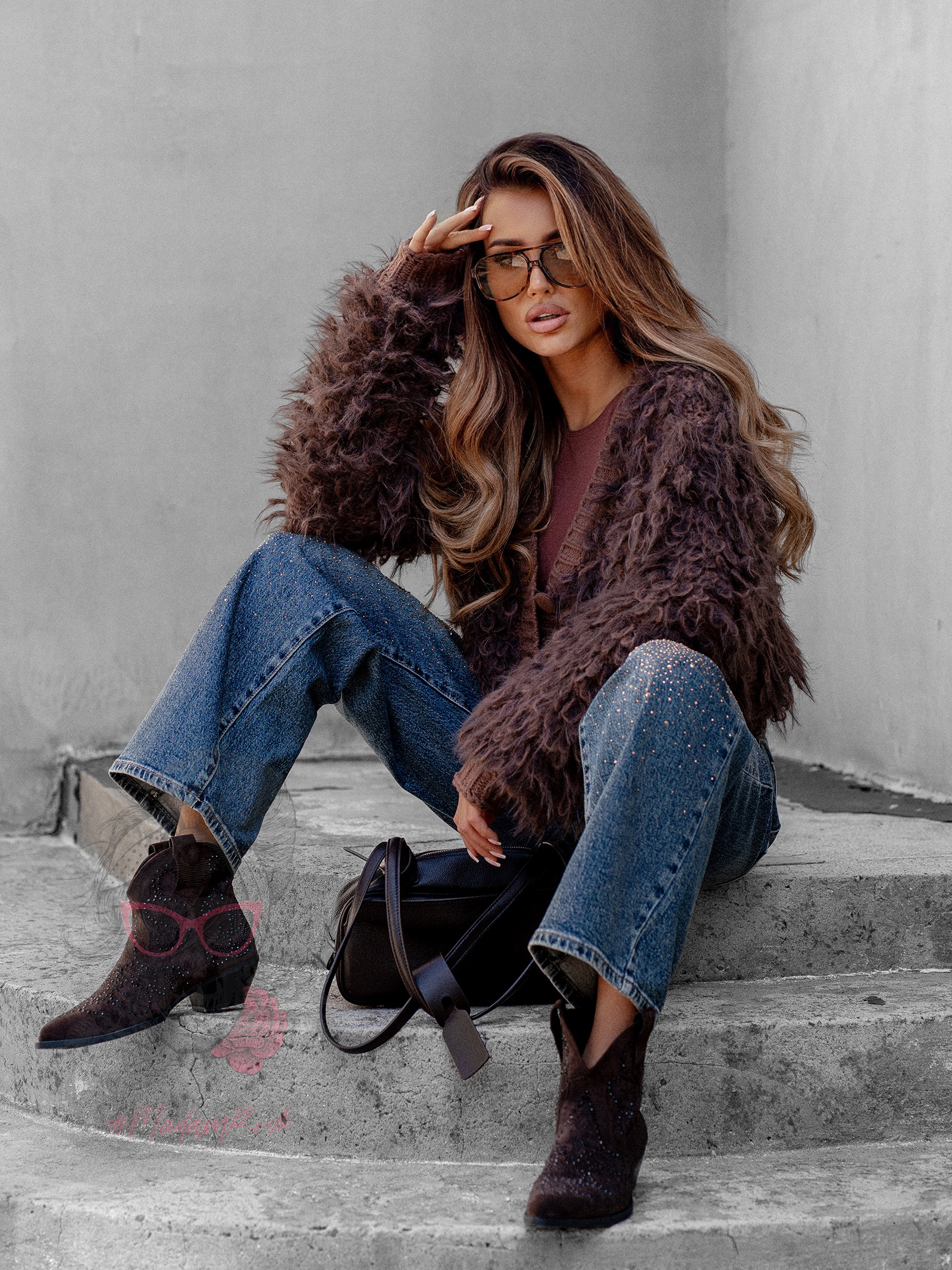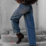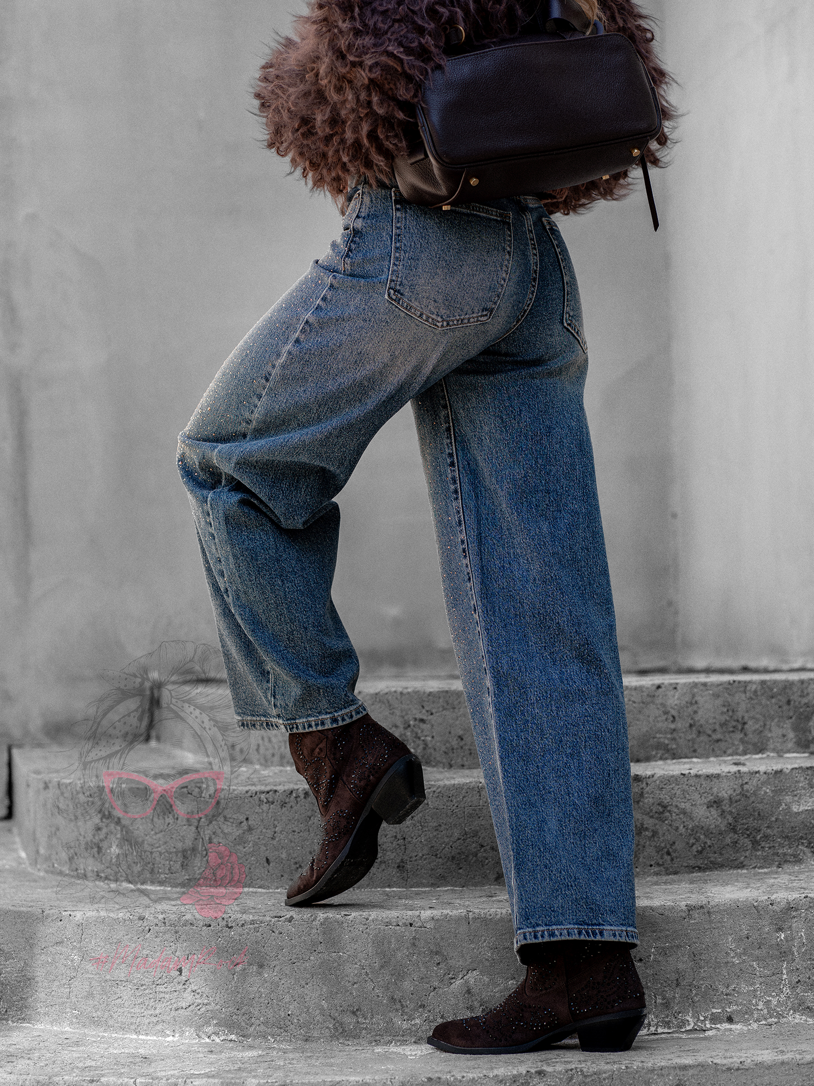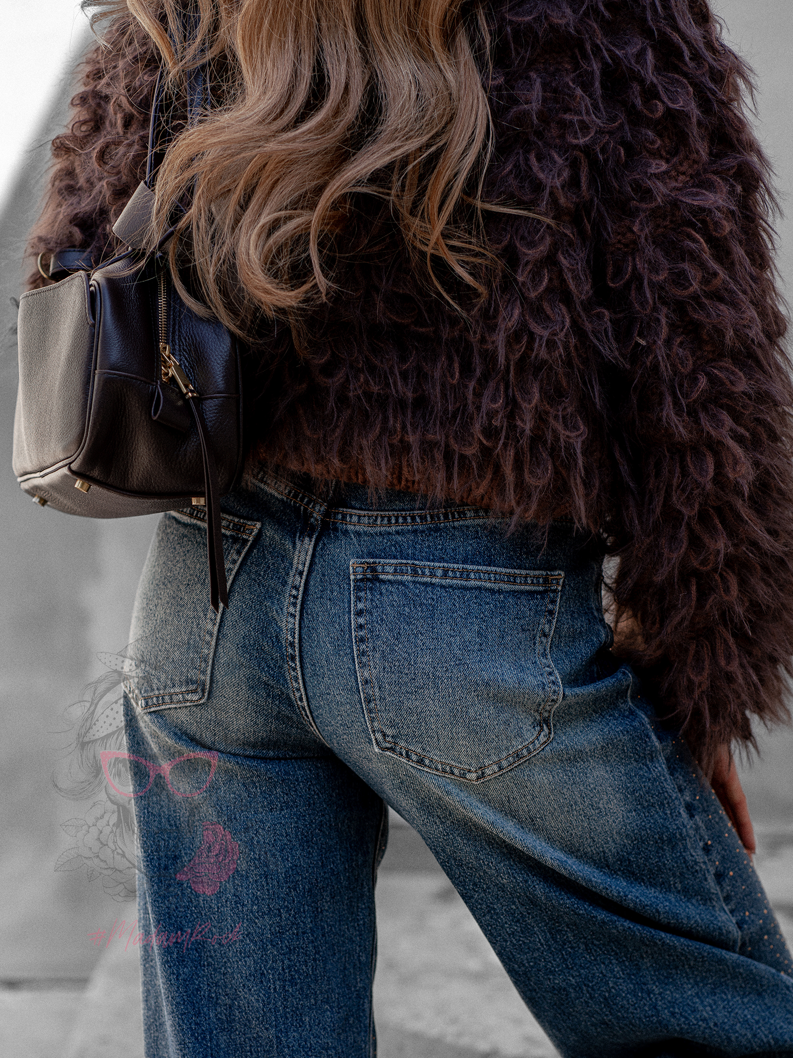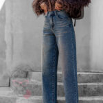 Spodnie jeansowe z cyrkoniami Aulo granatowe to jeansy, które łączą wygodę z nutą elegancji. Model Wide balloon w granatowym odcieniu z efektem dekatyzacji zachwyca swoim nowoczesnym krojem i prostymi, szerokimi nogawkami. Wysoki stan pięknie podkreśla sylwetkę, a klasyczne zapięcie na guzik i suwak zapewnia komfort noszenia. Tył pozostaje gładki i minimalistyczny, natomiast przód zdobią cekiny w odcieniu rose gold, które dodają całości wyjątkowego, kobiecego blasku. To idealne spodnie dla osób, które chcą połączyć casualowy styl z modnym, niebanalnym akcentem.