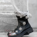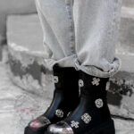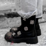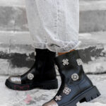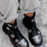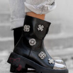 Wnętrze botków zostało delikatnie ocieplone filcem, co sprawia, że są one doskonałym wyborem na chłodniejsze dni. Uwagę przyciągają srebrne, plastikowe elementy dekoracyjne, które podkreślają charakter modelu i nadają mu wyjątkowego stylu. Dodatkowym akcentem jest srebrna aplikacja na nosku, imitująca metalową blaszkę – detal, który nadaje całości modnego, odważnego wyrazu.
